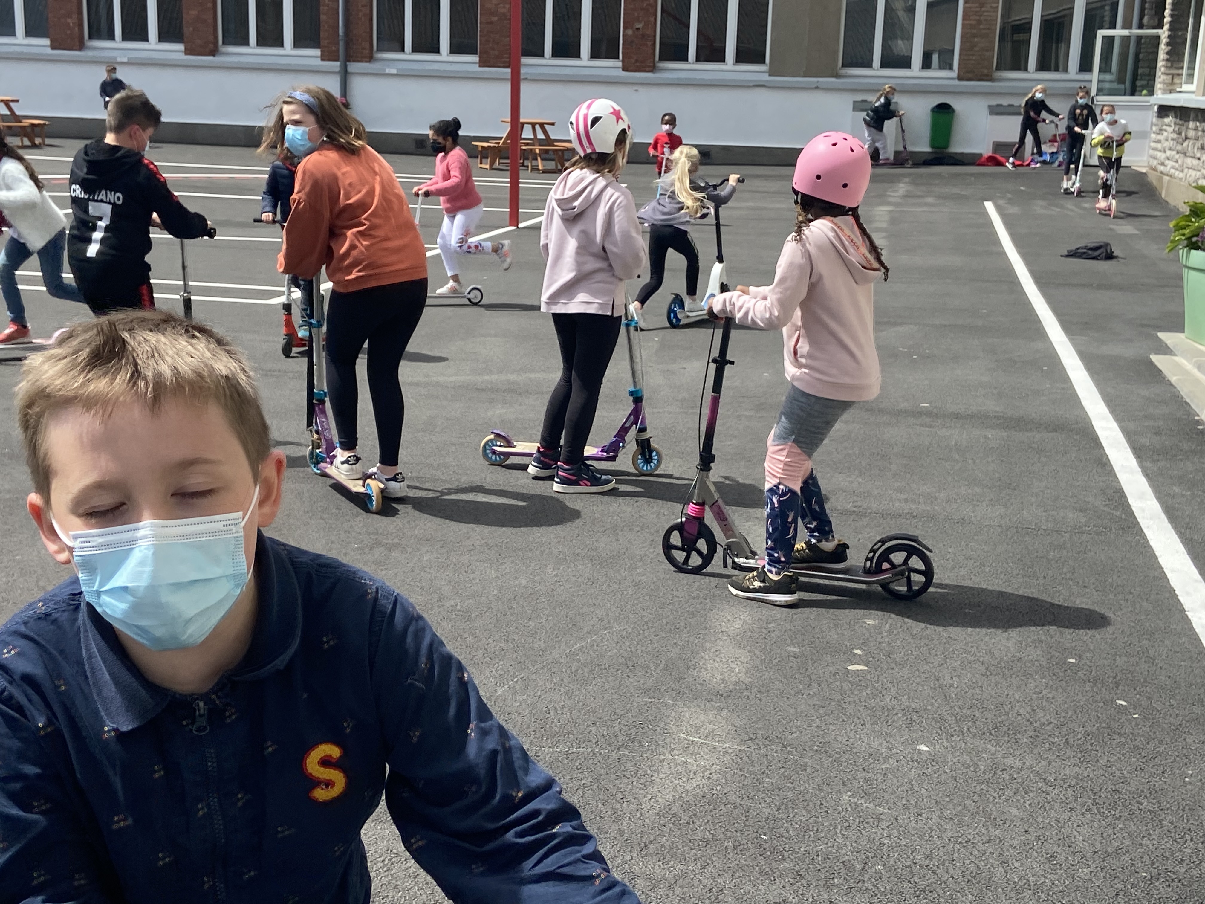 TROTTINETTES DES ECOLIERS DANS LA COUR DU COLLEGE